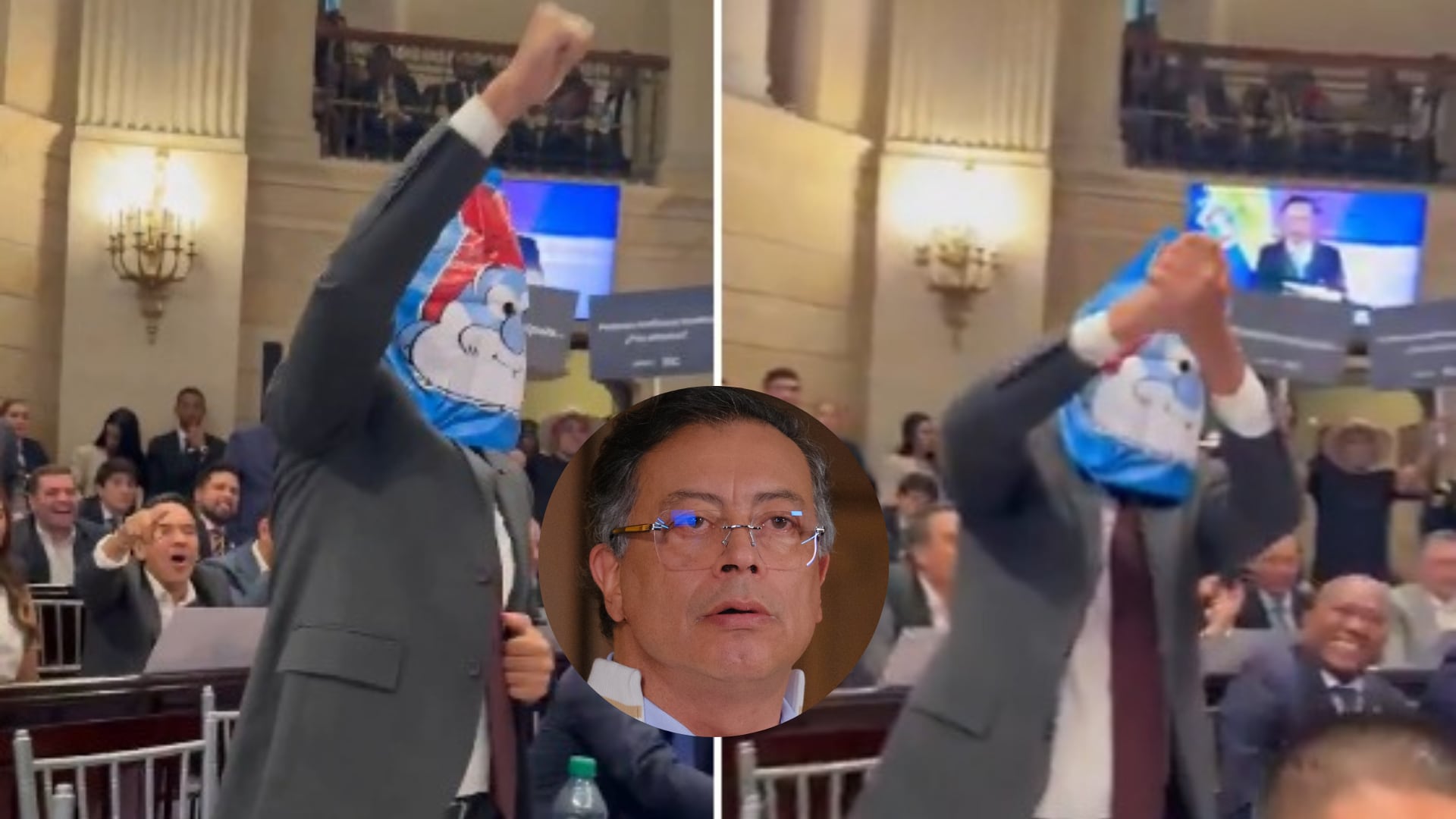 El representante a la Cámara José Jaime Uscátegui, del partido Centro Democrático, se puso una máscara de Papá Pitufo mientras el presidente Gustavo Petro estaba en pleno discurso, lo hizo para recordar los posibles nexos entre la campaña del presidente el zar del narcotráfico Diego Marín Buitrago.