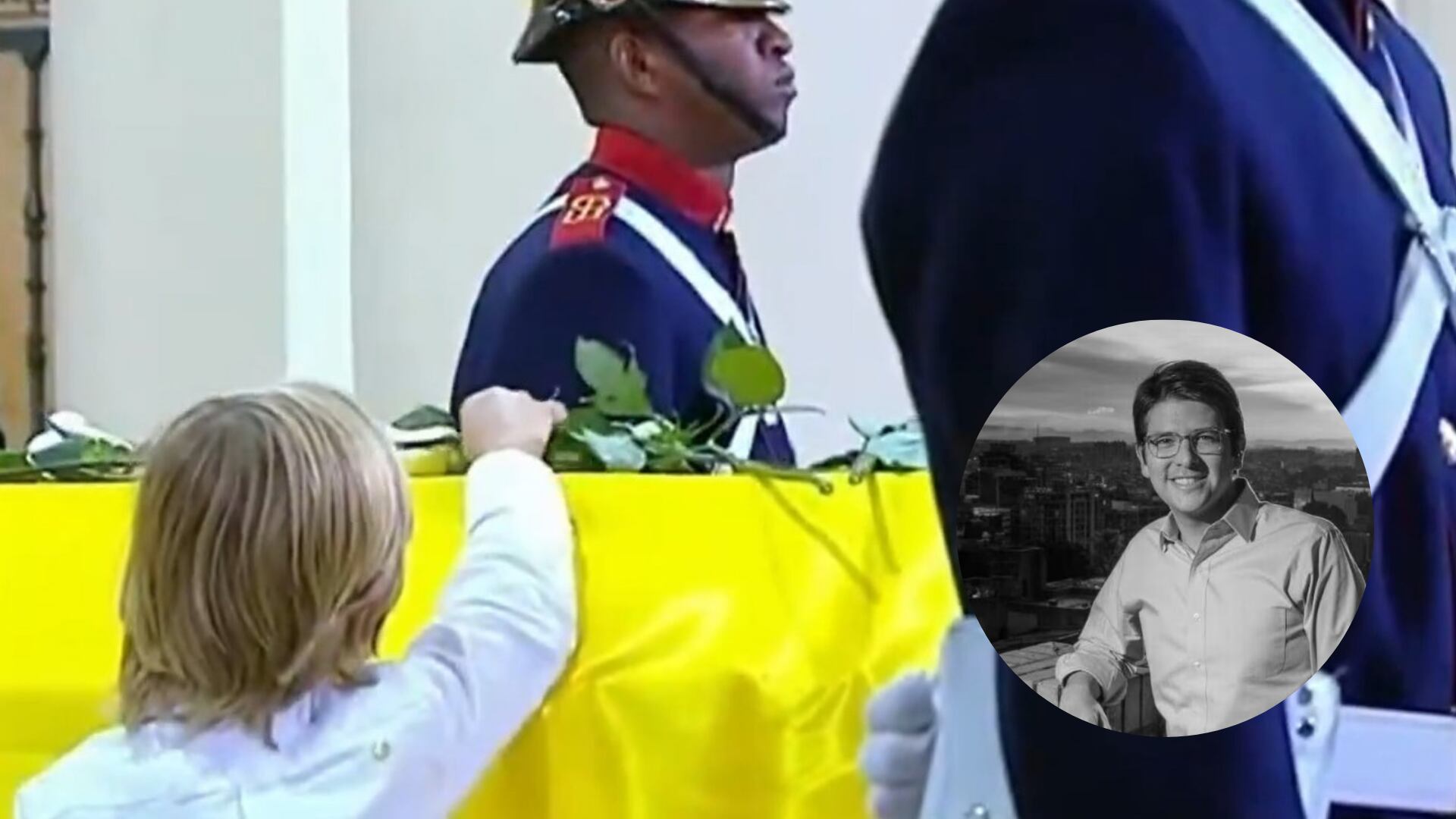 En las imágenes quedó captado el instante en el que pequeño Alejandro de solo cuatro años, vestido con camisa blanca y pantalón negro, se acercó hasta el féretro de su padre, cubierto con la bandera de Colombia y le dejó una rosa blanca en el centro.