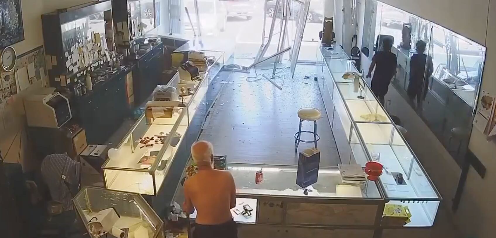 De acuerdo con imágenes difundidas en redes sociales, los delincuentes utilizaron una camioneta SUV para embestir la puerta principal y abrirse paso al interior del establecimiento. Una vez dentro, agredieron al propietario, que cayó al suelo mientras rompían vitrinas y sustraían joyas exhibidas.