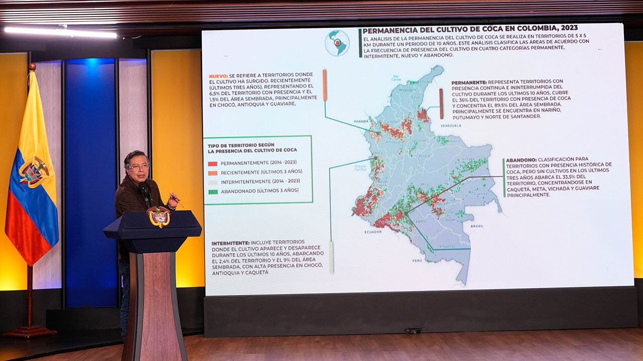 En su explicación, con mapas satelitales, el presidente Petro mostró los puntos rojos de concentración de cultivos ilícitos, que se focalizan principalmente en los departamentos de Nariño, Cauca, Chocó, Putumayo y la región del Catatumbo, así como los territorios donde se siembra temporalmente y, los que más destacó, los pintados de verde, que son los que han sido abandonados.