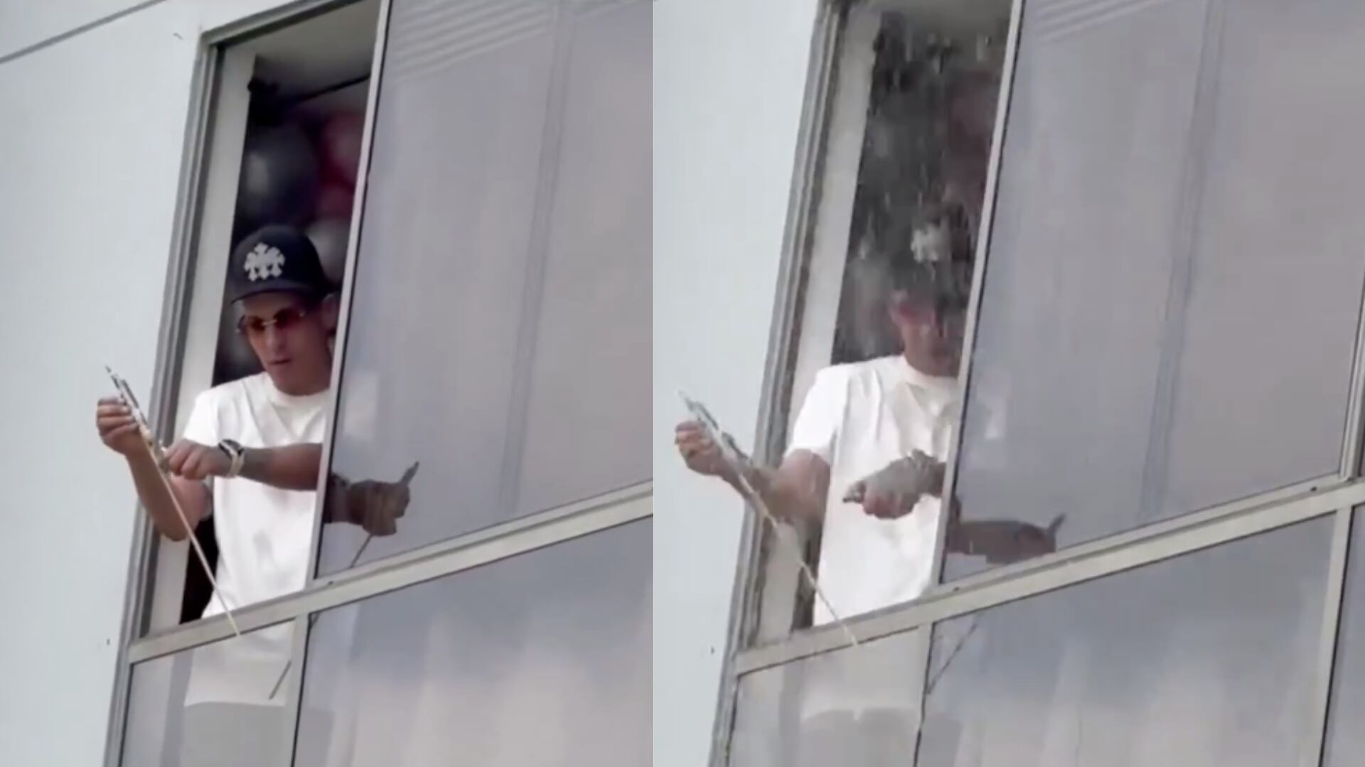 En diferentes grabaciones publicadas en redes sociales se ve como el hombre, en horas de la mañana, tira petardos desde su hogar, lo que afecta a sus vecinos por el ruido y el peligro que estos generan. en un momento, después de lanzar varios de estos artefactos, un habitante de un apartamento superior decide protestar ante el hecho lanzándole un baldado de agua.