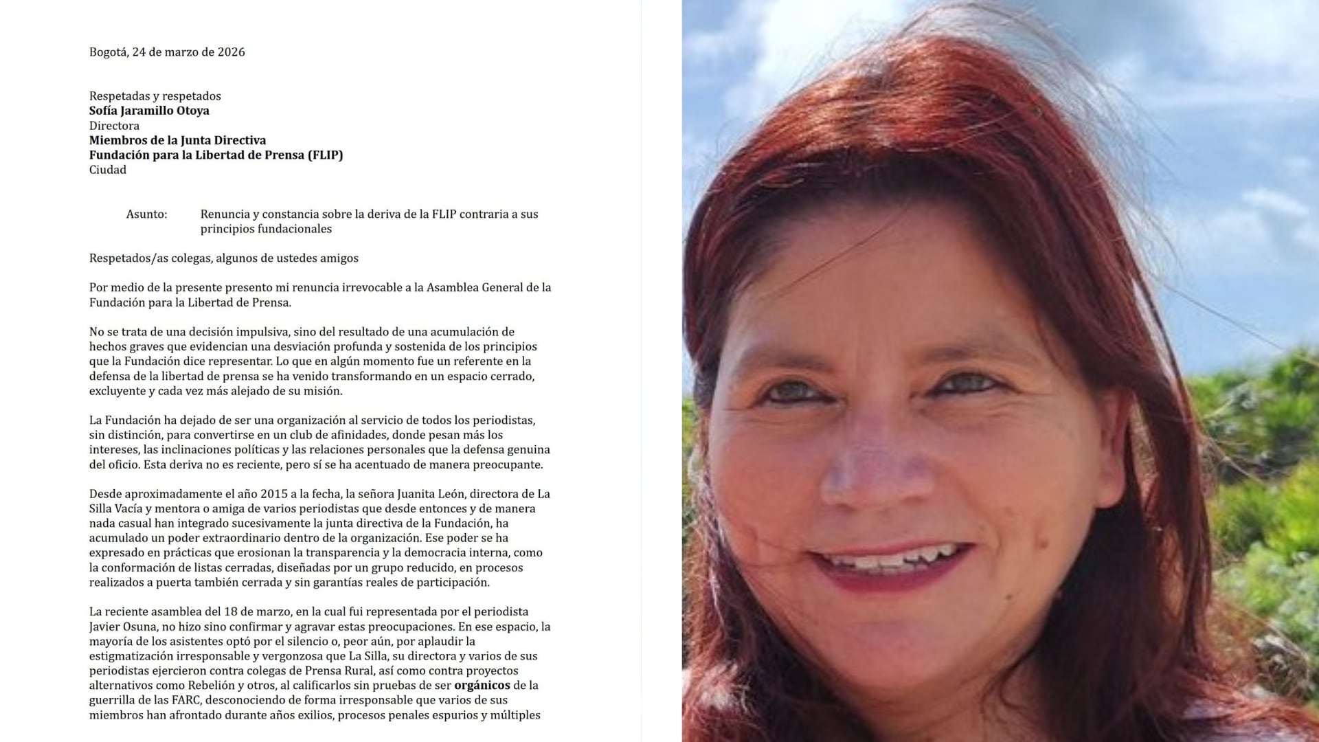 La periodista sostiene que la FLIP, que durante años fue referente en la defensa de la libertad de prensa, “se ha venido transformando en un espacio cerrado, excluyente y cada vez más alejado de su misión”.