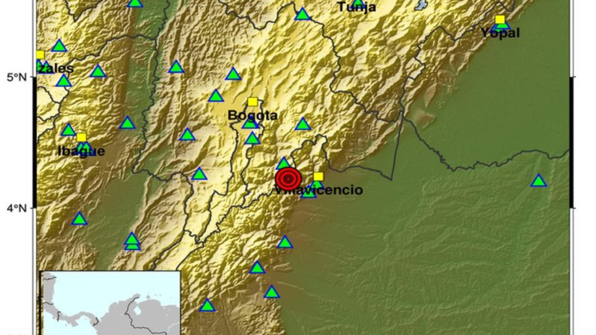 Según el mapa publicado por el Servicio Geológico Colombiano, el evento se presentó Villavicencio, en el departamento del Meta, y se sintió con fuerza en la capital del país.