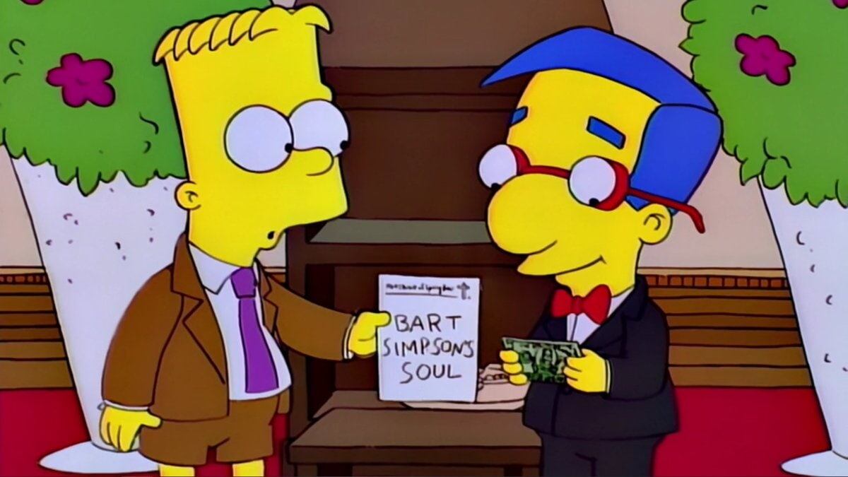 El episodio de Los Simpson “Bart Sells His Soul” ve a Bart, que no cree en el alma, vender el suyo a Milhouse por $ 5 solo para luego arrepentirse y no poder volver a comprarlo. El drama llega a su fin cuando Bart llega a comer el papel físico en el que garabateó “Bart Simpson’s Soul”.
