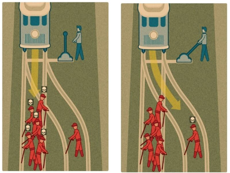 Un tren a toda velocidad y descontrolado por las vías está a punto de arrollar a cinco personas. Un individuo tiene en sus manos la posibilidad de halar una palanca y cambiar los rieles y con ello la dirección del vagón, pero al hacerlo, en lugar de cinco, moriría un solo ser.