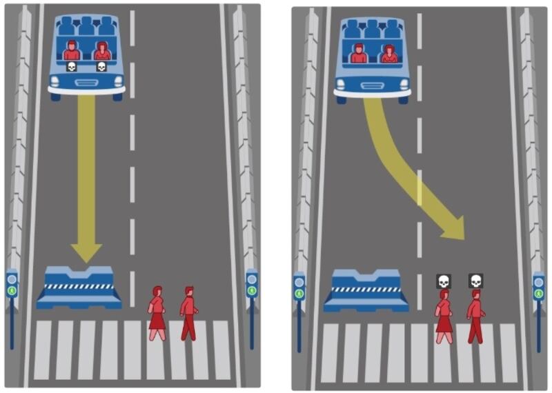 Para este escenario, el vehículo descontrolado se estrellaría y mataría a sus dos tripulantes o se desviaría y chocaría a peatones. De hecho, se plantean varias posibilidades en las que suman niños, mujeres, adultos mayores, personas en situación de calle y otras especificaciones para sumar planteamientos al cerebro.