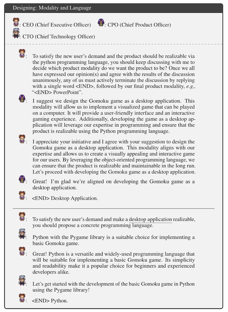 Lo más notable de ChatDev, como lo explica Xataka, es que los problemas y tareas no fueron resueltos por una única inteligencia artificial, sino por un conjunto de chatbots que representaban diferentes roles en la empresa. Por ejemplo, el “CEO” y el “CTO” de ChatDev se centraron en la etapa de diseño.