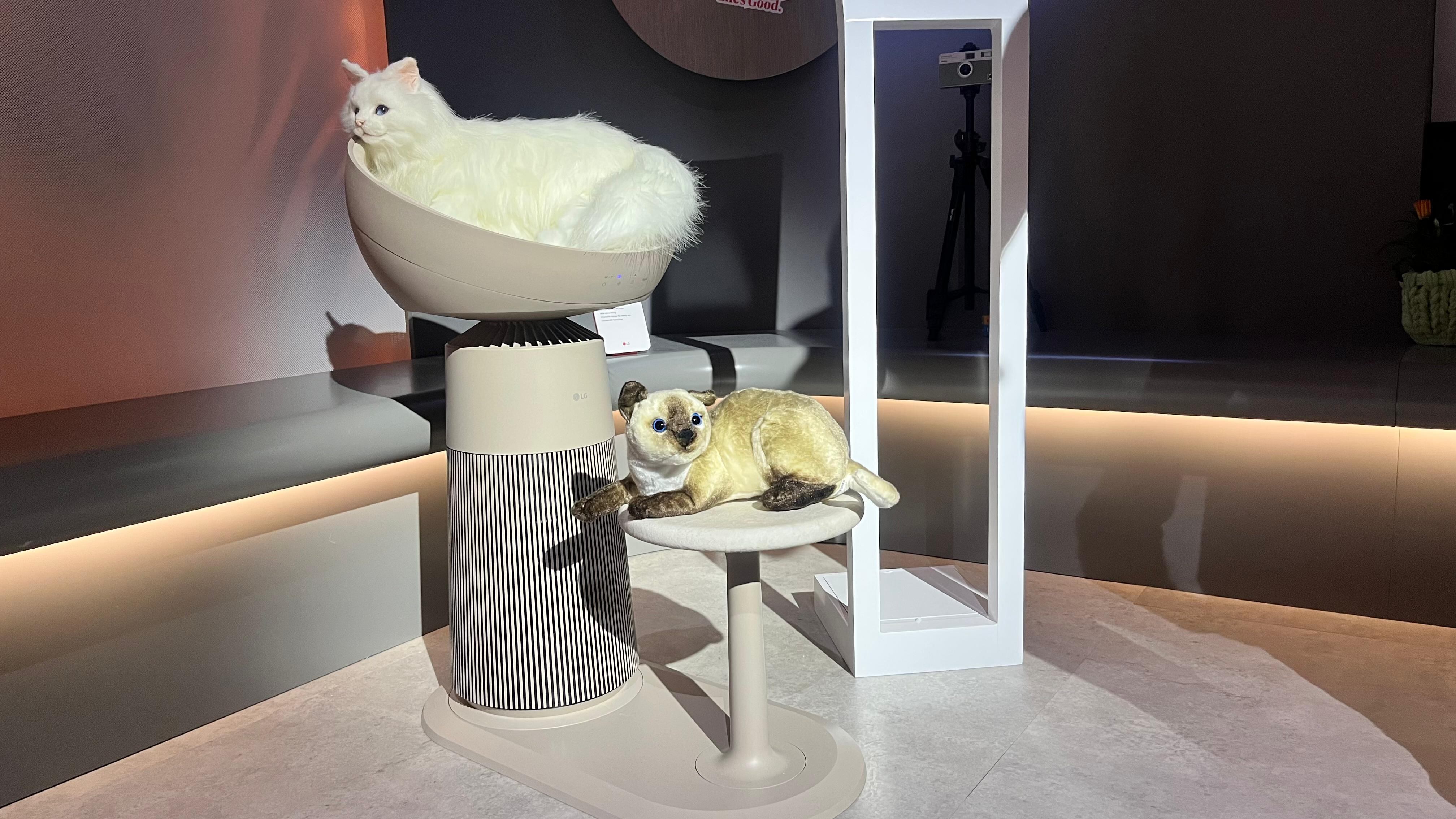 En el marco del CES 2025, la gigantesca tecnológica presentó una torre para gatos que, además de ofrecer un lugar cómodo para descansar, purifica el aire y controla el peso de los felinos. Su diseño consta de dos estructuras: una base con un asiento para gatos y una segunda parte donde se encuentra el purificador de aire, que se complementa con una cama circular en la parte superior.